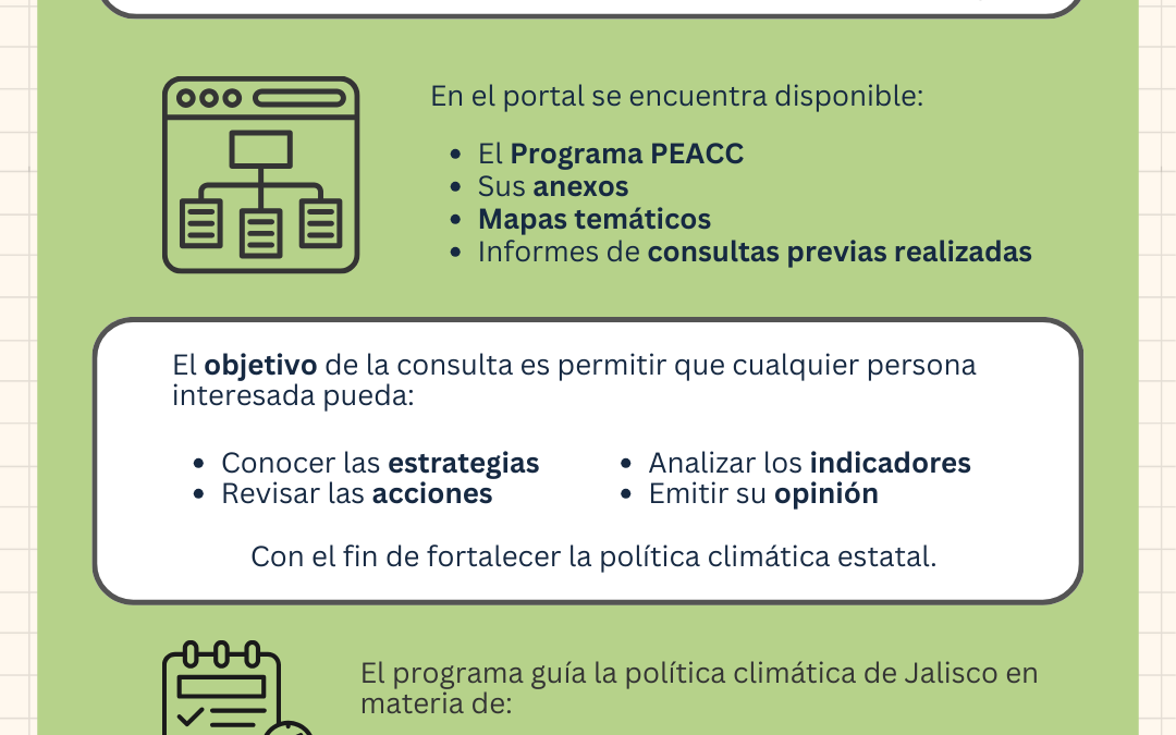 El 17 de febrero de 2026 se habilitó el portal oficial de consulta del Programa Estatal de Acción ante el Cambio Climático (PEACC) de Jalisco, publicado por la Secretaría de Medio Ambiente y Desarrollo Territorial.